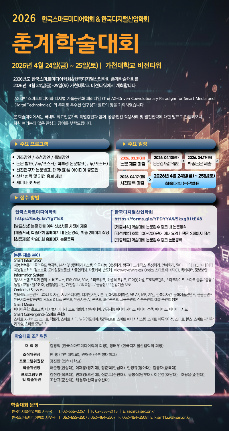 [논문모집]2026년 한국디지털산업학회&한국스마트미디어학회 춘계학술대회 논문모집 안내