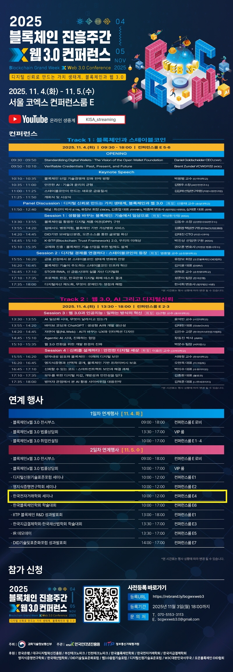 2025년 11월 4일~5일, 과학기술정보통신부 주최하고 한국인터넷진흥원이 주관하는「2025 블록체인 진흥주간 X 웹3.0 컨퍼런스」가 개최됩니다.